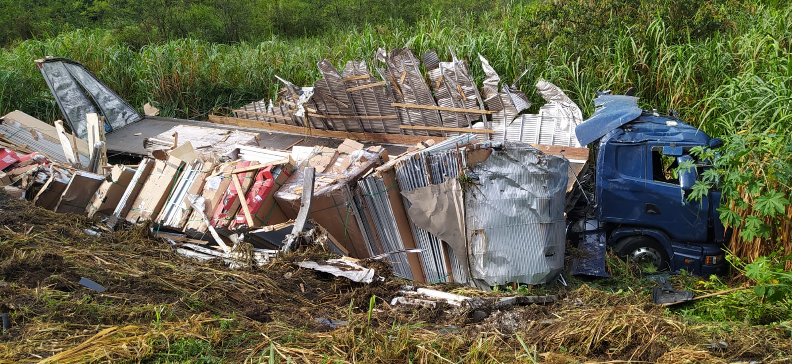 Um motorista de uma carreta, de 25 anos, ficou ferido após o veículo tombar no trecho