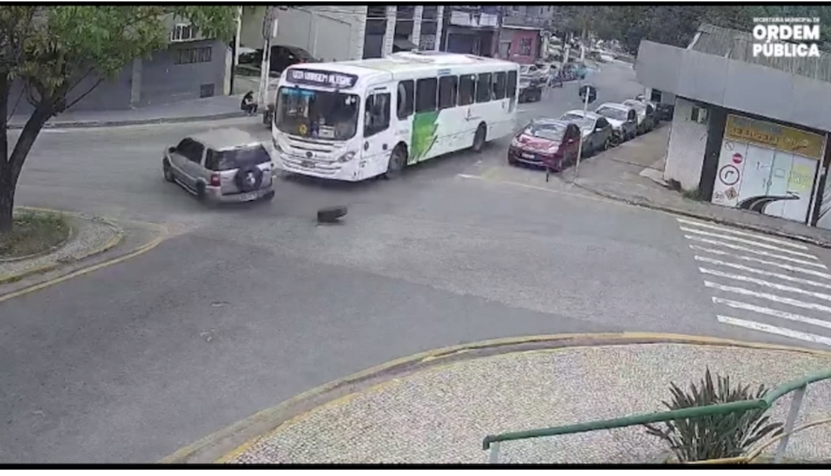 As câmeras de segurança que monitoram a cidade registraram uma colisão envolvendo um ônibus e um