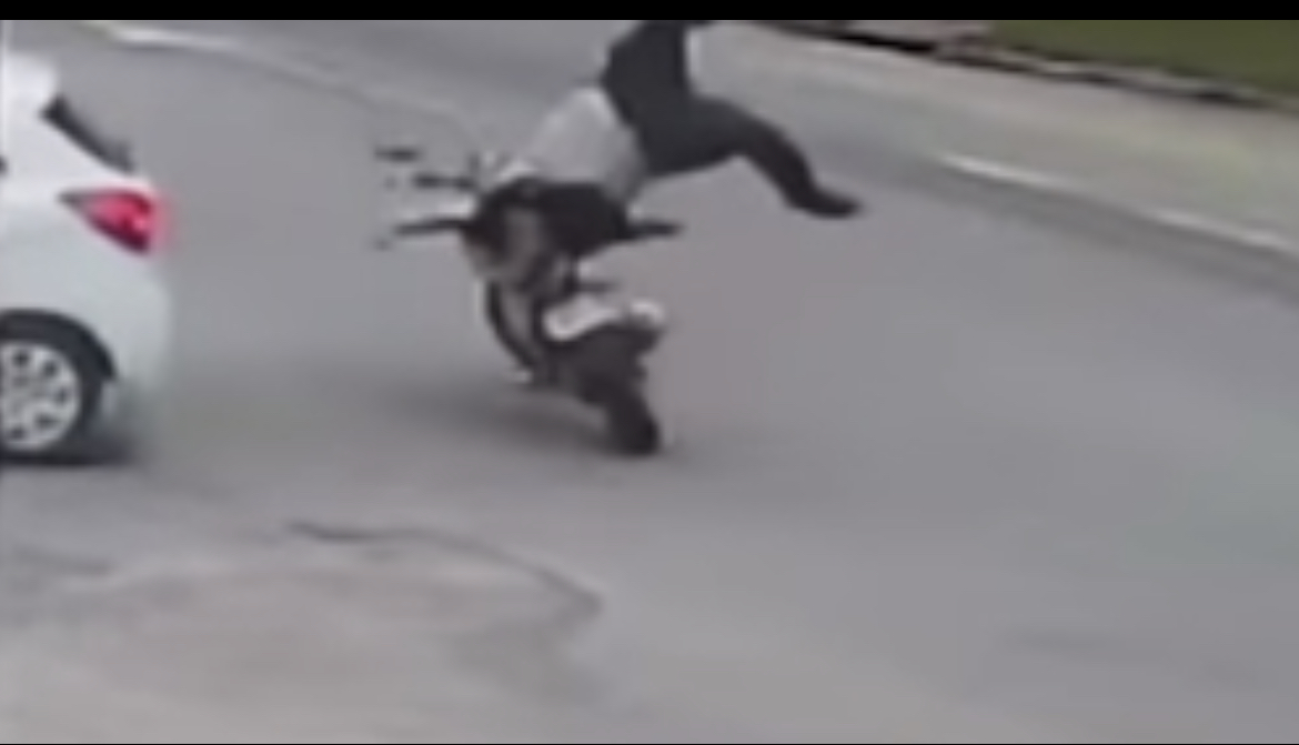 Imagens de segurança mostram o momento em que um carro e uma motocicleta se colidiram nesta