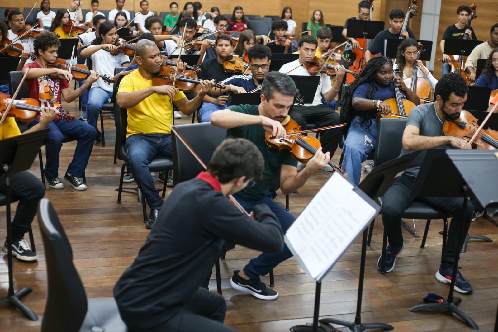 A Orquestra de Cordas do projeto Volta Redonda Cidade da Música, regida pela maestra Sarah Higino,