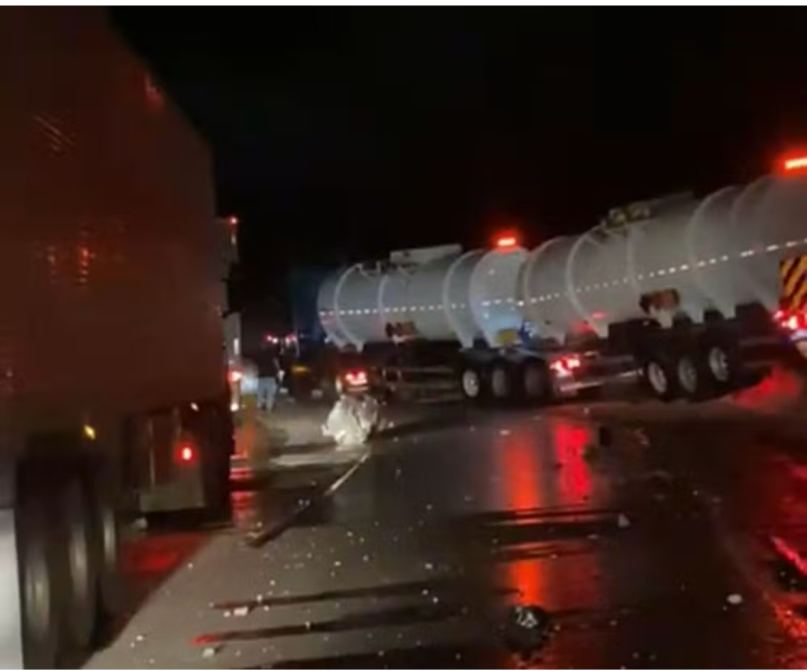Uma carreta de combustível bateu em uma mureta de proteção na manhã desta quarta-feira (2) e