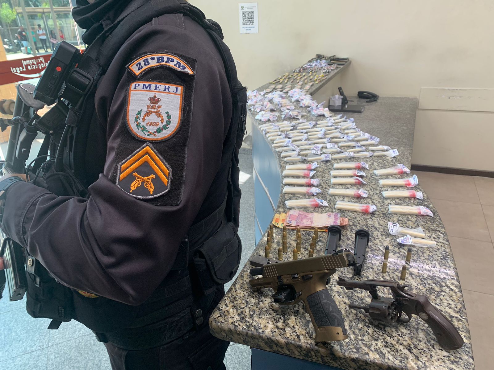 Chegando, os agentes encontraram mais três jovens – 27, 17 e 16 anos – saindo do imóvel. Pela janela da residência, os policiais avistaram uma arma e sacos com drogas. No total, a operação apreendeu: 201 pinos de cocaína, 113 trouxinhas de maconha e 64 pedras de crack.
