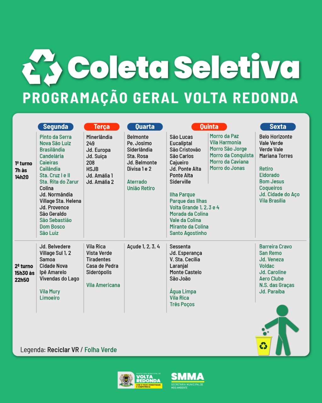 A Prefeitura de Volta Redonda anunciou o cronograma para 2023 da coleta seletiva domiciliar. O serviço porta a porta é feito de segunda a sexta-feira, das 7h às 14h20, e das 15h30 às 22h50. Cerca de 100 localidades do município são beneficiadas pela coleta, que é feita semanalmente. Duas cooperativas contratadas – Folha Verde e Reciclar VR – são responsáveis pelo recolhimento do material reciclável, além de transportar e destinar os resíduos descartados pela população.