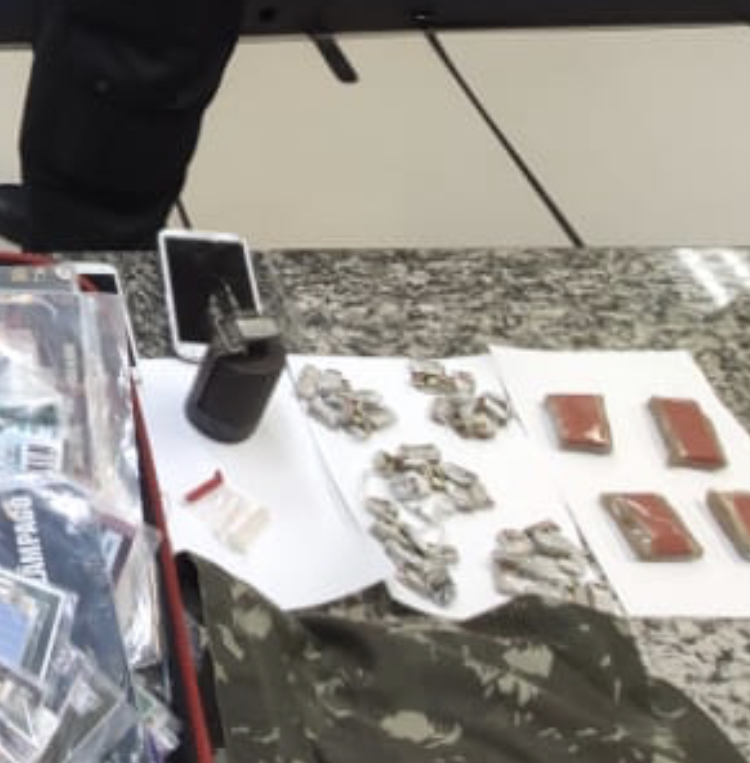 Dentro da casa, segundo a PM, foram encontrados quatro tabletes de maconha; 49 trouxinhas da mesma droga, roupas camufladas e mídias pirateadas.