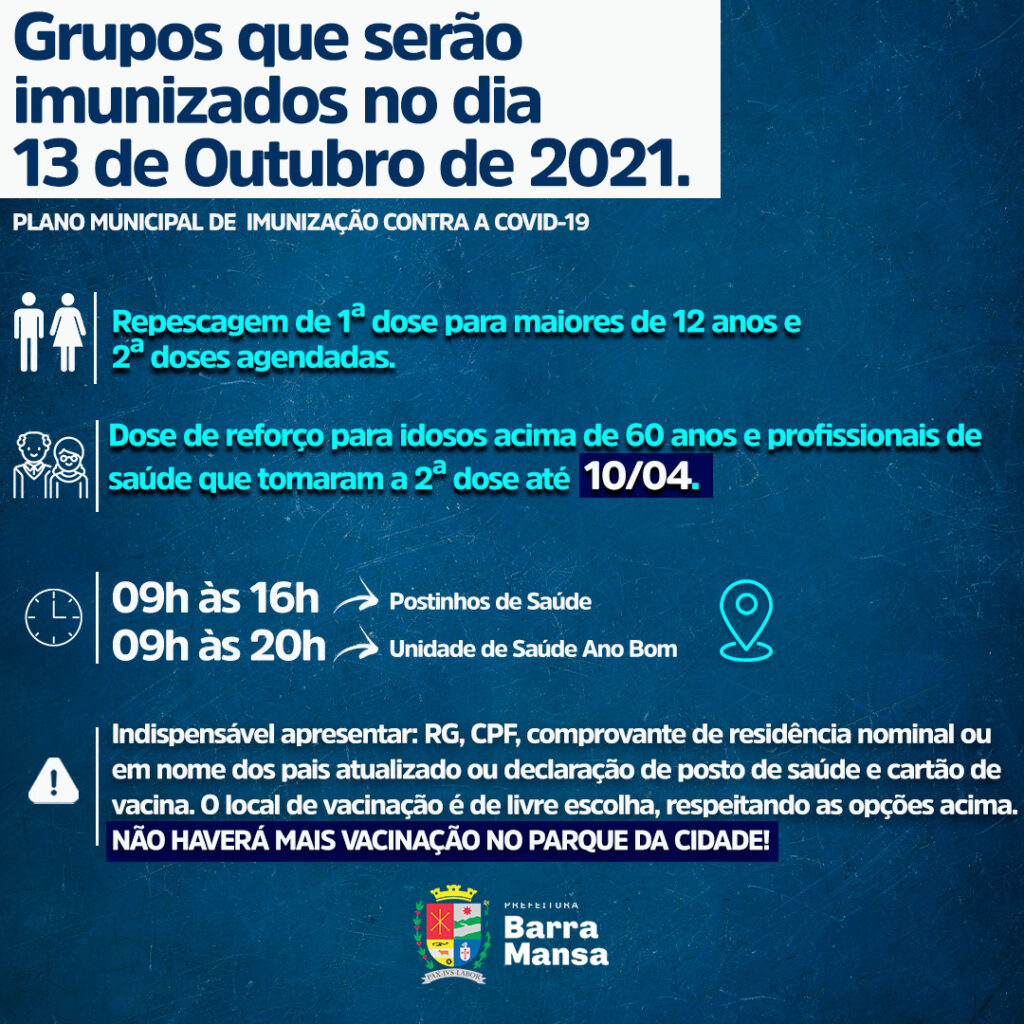 Haverá repescagem para aplicação da primeira dose em pessoas com 12 anos ou mais. As segundas doses de AstraZeneca estão disponíveis para quem tomou a primeira dose até 18/08/2021, caso acabe as remessas de AstraZeneca, a pessoa apta a receber a dose neste dia poderá optar pela intercambialidade de vacinas e receber a segunda dose da Pfizer. Também serão vacinadas com a segunda dose da Pfizer as pessoas que tomaram a primeira dose até 18/08/21. A segunda dose da Coronavac será aplicada em quem recebeu a primeira até 23/09/21.
