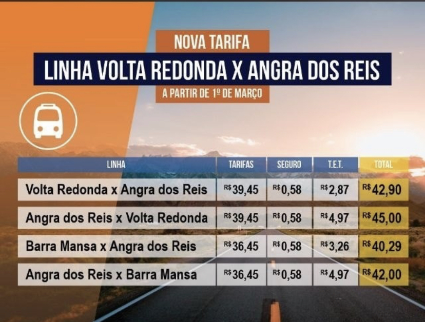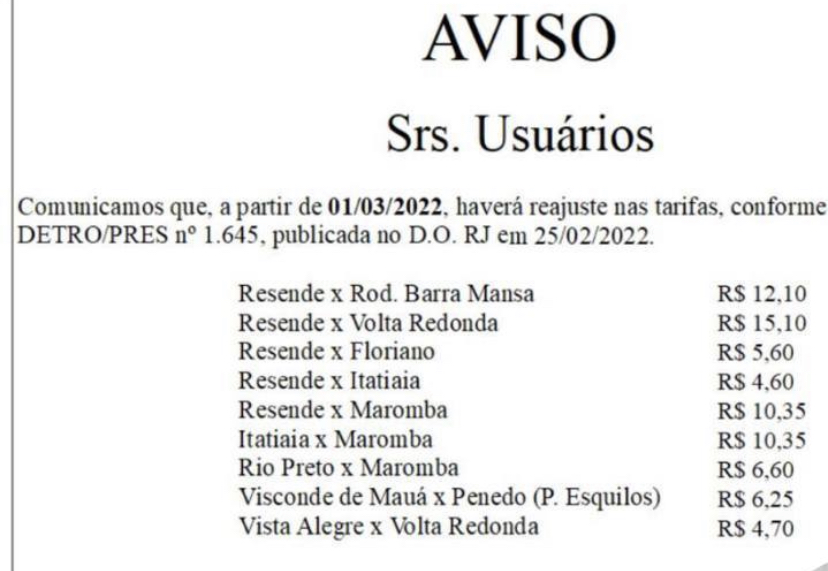 Segundo o Detro, os índices adotam os critérios do Grupo Executivo de Integração da Política de Transportes (Geipot). A tarifa da linha Volta Redonda-Barra Mansa, via Ano Bom, que era R$ 4,45 passou para R$ 4,70.