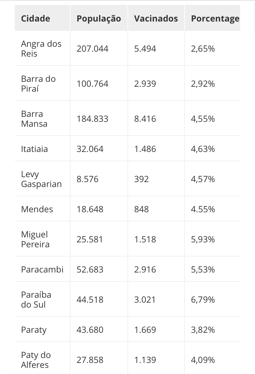 A vacinação contra a Covid-19 começou no dia 19 de janeiro nas cidades do Sul e Costa Verde do Rio de Janeiro. Atualmente, a campanha vai sendo ampliada para mais faixas etárias de idosos, mas depende do envio de novas remessas de vacinas aos municípios.