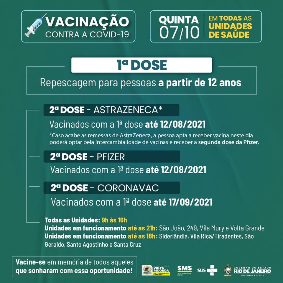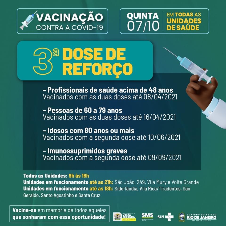 As prefeituras de Volta Redonda e Barra Mansa estão dando continuidade no processo de imunização contra a Covid nesta quinta-feira (7). Confira abaixo quem pode vacinar nas duas cidades, segundo informações dos governos municipais.