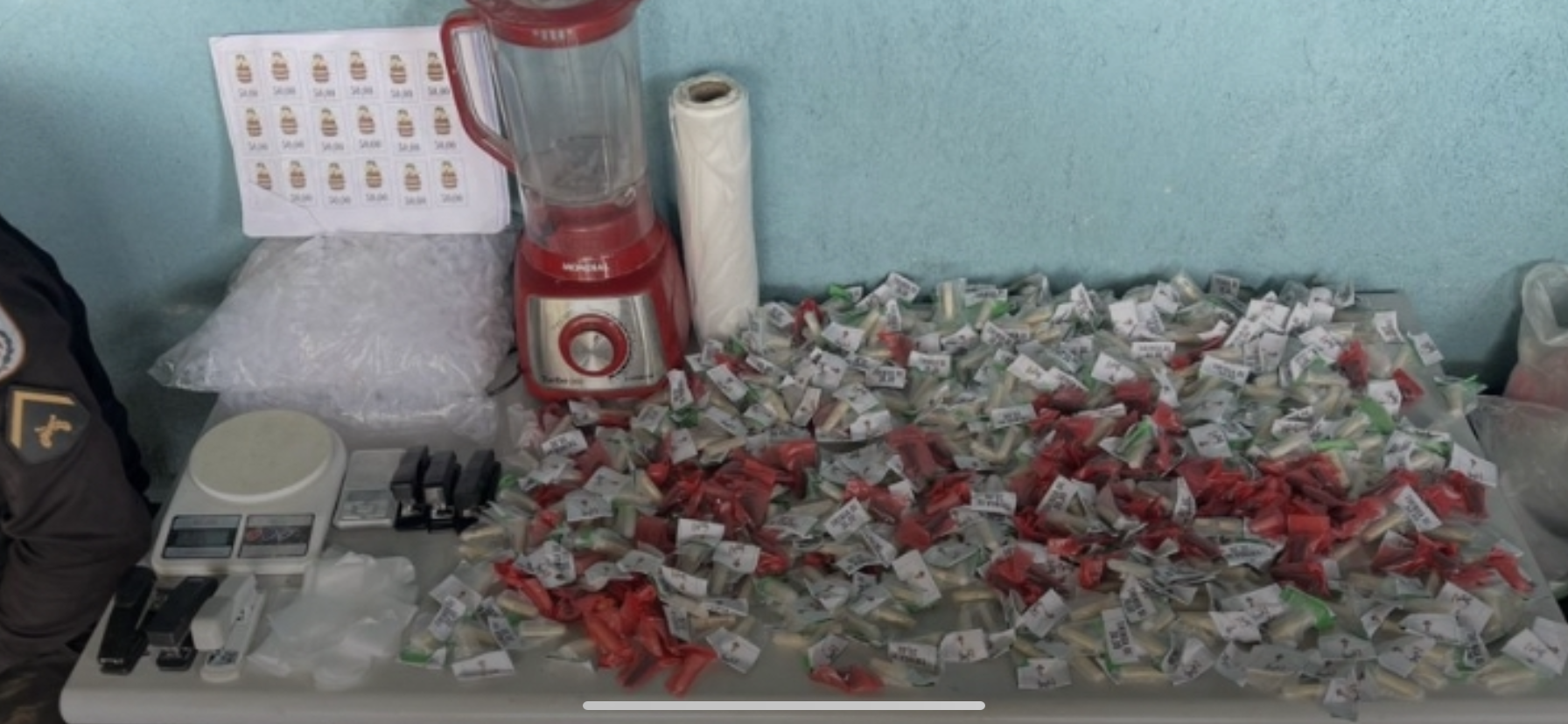 No imóvel, foram encontrados 540 pinos de cocaína a descrição (“TIRINGA DE 30,00”); 1.000 pinos vazios; duas balanças de precisão; um liquidificador; três grampeadores; cinco potes plásticos; uma peneira; além de 28 folhas A4 com etiquetas impressas “50,00”.