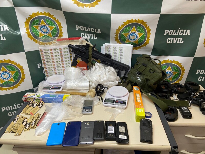 No local, foram encontrados rádios de comunicação, papeis para a embalagens de drogas, três celulares, sacos para individualizar as drogas, carregadores de rádio, um kit para alonga pistola, uma balança de precisão, além de outros itens para a embalagem dos entorpecentes.