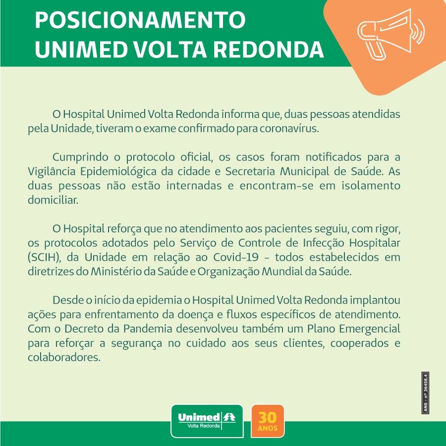 Os dois pacientes, que testaram como positivos para o coronavírus, foram atendidos pela Unimed Volta Redonda. A informação foi confirmada pela própria unidade médica da cidade, nas redes sociais.