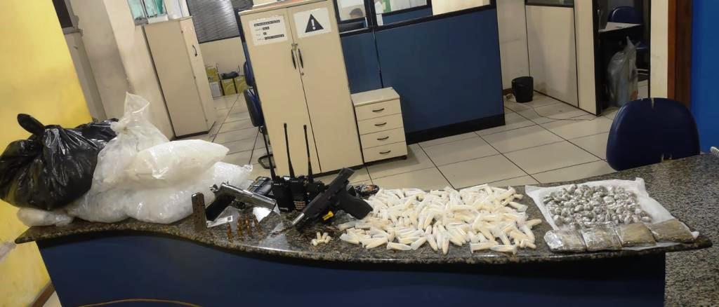 Após o confronto, os policiais apreenderam duas pistolas, uma das quais com numeração raspada, dois carregadores, 12 munições calibre 9mm, seis rádios de comunicação com duas bases, 90 unidades de maconha prensada, 207 pinos de cocaína e grande quantidade de material para embalar entorpecentes.
