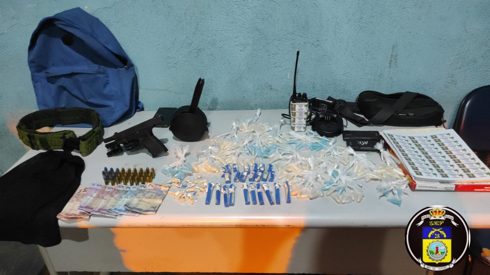 Chegando próximo a um escadão, os agentes encontraram os dois suspeitos – um de 16 anos e outro de 34 anos. Na revista pelo local, foram encontrados uma pistola 9 mm, 34 munições, 204 pinos de cocaína, dois celulares, rádios de comunicação, touca ninja, dois celulares, além de carregadores.
