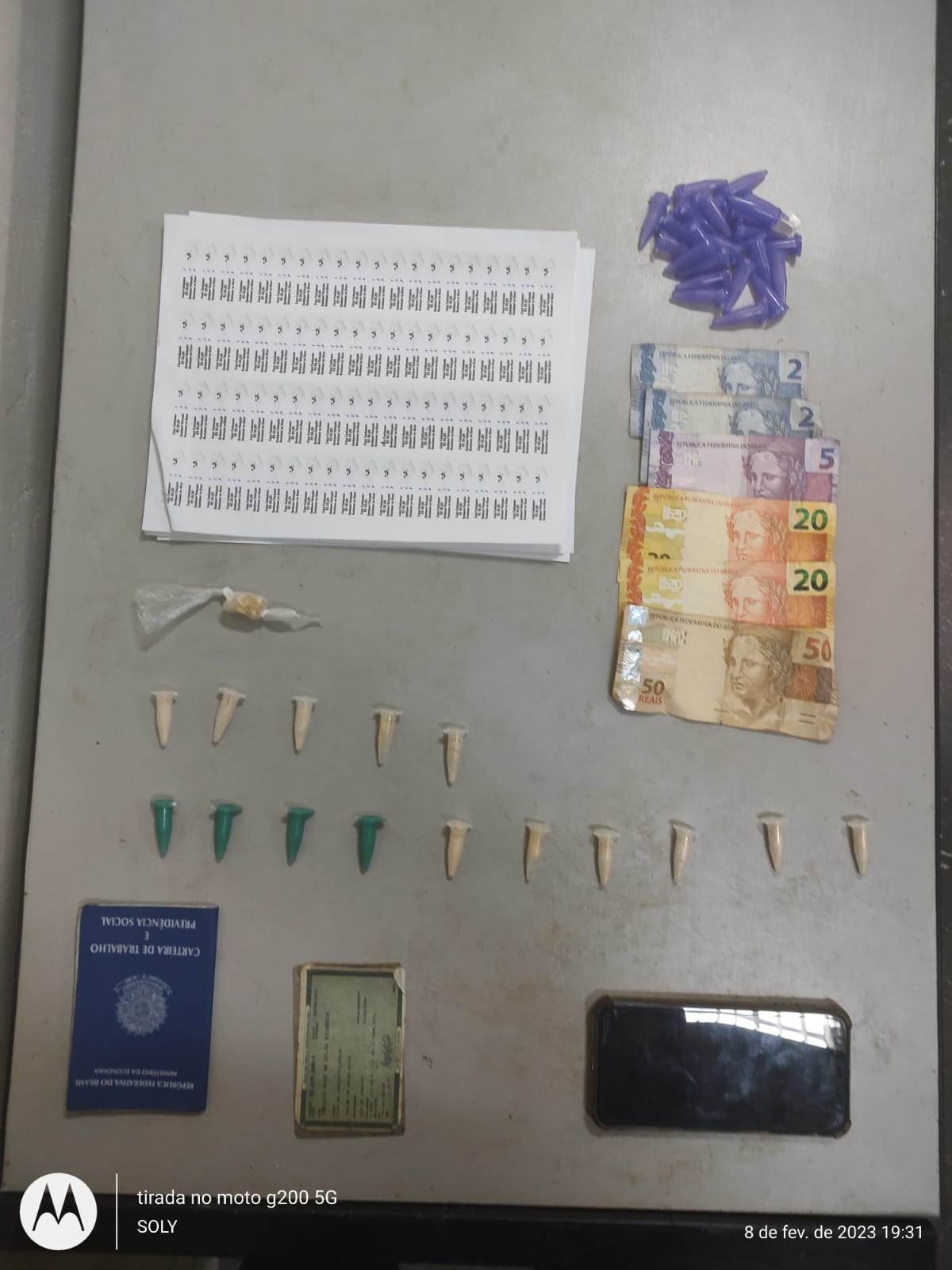No local, os policiais detiveram os dois suspeitos com material para endolação, 15 pinos de pó branco (cocaína) e 25 eppendorfs (tubos para embalar entorpecentes), e um telefone celular.