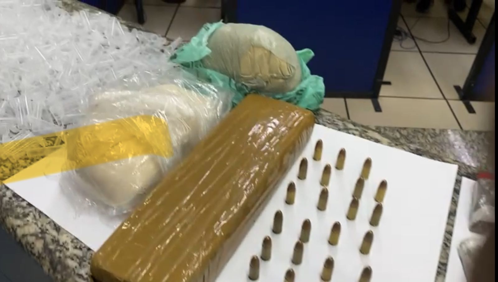 Havia ainda 25 munições de calibre 9 mm e R$ 430 em espécies. Todo material estava escondido no sofá na casa. O casal não estava na residência e não foi encontrado, mas já está identificado. As drogas e os materiais foram levados para a delegacia de Porto Real (100º DP).