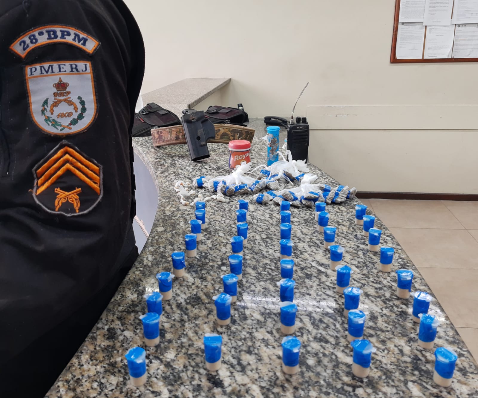 Chegando, vários suspeitos fugiram quando perceberam a aproximação da viatura. Segundo a PM, no entanto, onde eles estavam foram arrecadados 41 pinos de cocaína, 31 sacolés de maconha, 16 pedras de crack, um cinto tático e dois coldres.