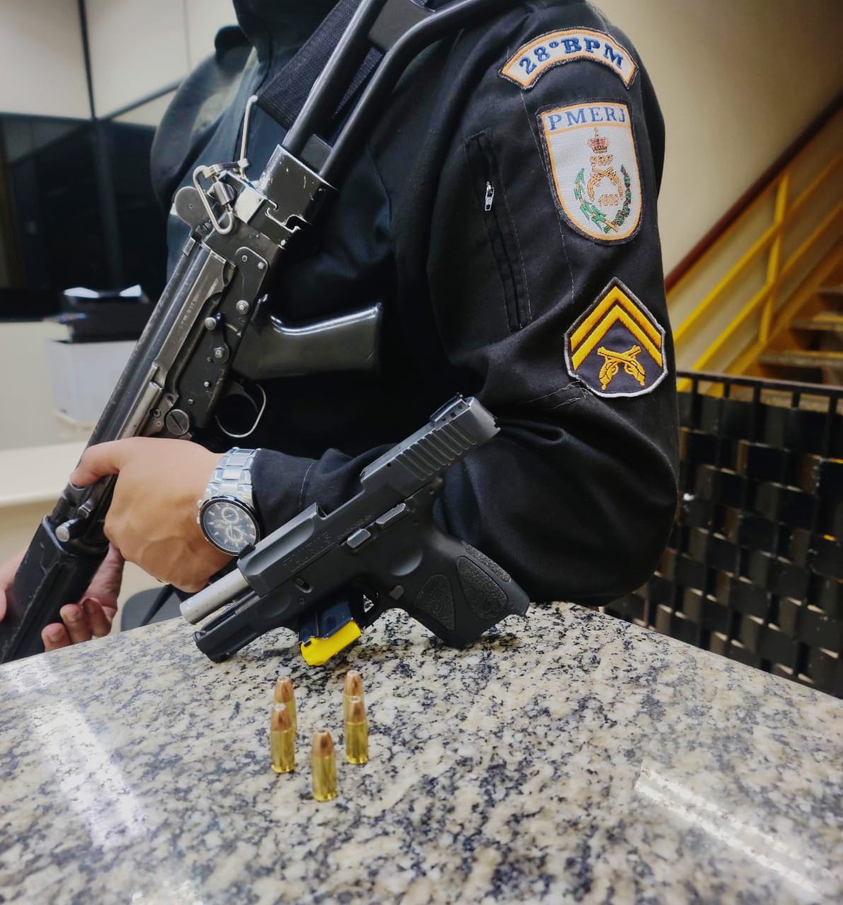 Segundo a ocorrência, que foi atendido pelos cabos da PM Dos Reis e Túlio, uma pistola calibre 9mm com cinco munições foram apreendida.