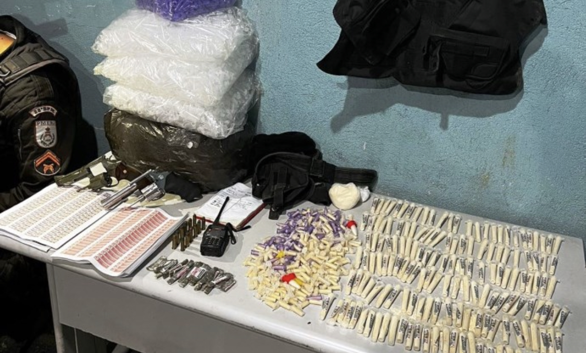 Chegando, os militares avistaram os dois suspeitos e, com eles, havia dois revólveres calibre 38, ambos municiados com seis balas, 20 tabletes de maconha, 441 pinos de cocaína e uma sacola contendo cerca de 200 gramas do mesmo entorpecente.