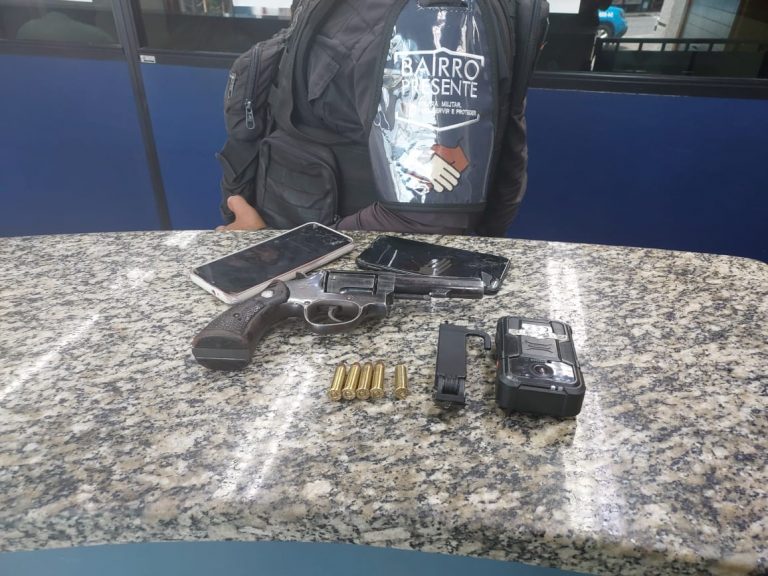 Chegando, os agentes encontraram a dupla que a denúncia dizia e, em revista, nada de ilícito foi encontrado. Porém, em varredura nas proximidades, os policiais encontraram um revólver calibre 38 com quatro munições intactas e uma deflagrada.