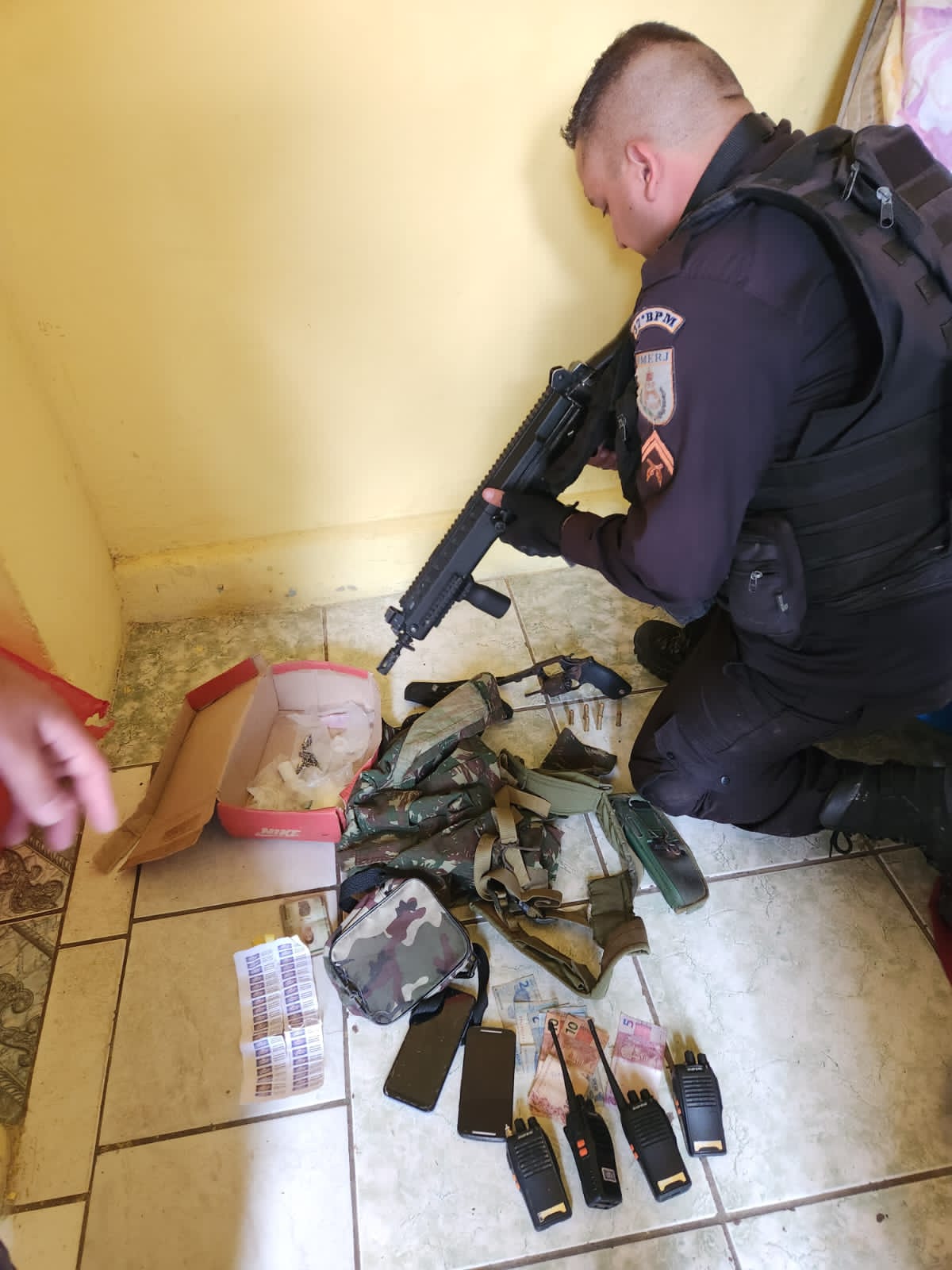 Numa revista minuciosa, os agentes encontraram um revólver 38 com cinco munições, certa quantidade de dinheiro, três rádios de comunicacação e materiais de endolação. Os dois jovens foram levados para a delegacia de Resende (89º DP). Eles foram autuados por porte ilegal de arma e associação ao tráfico. O terceiro jovem foi ouvido e liberado.