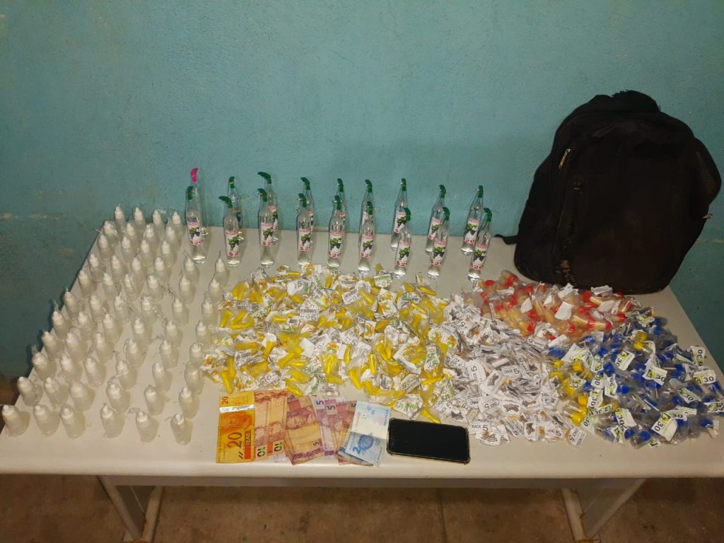Segundo a ocorrência, os policiais militares foram até o endereço par verificar uma denúncia de tráfico. Chegando, os agentes flagraram os dois suspeitos com drogas. Foram apreendidos 300 pinos de cocaína, 120 skanks, 180 pedras de crack, 60 frascos de loló, 18 tubos de lança perfume e R$ 84,00 em espécie.