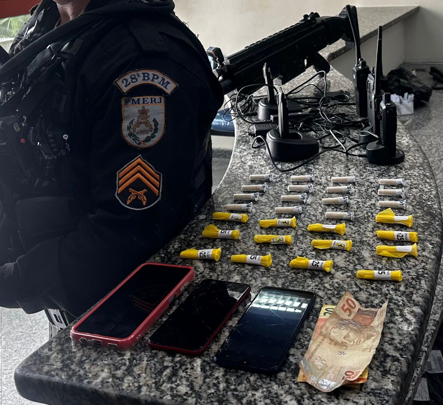Autorizado a entrar no imóvel pela proprietária, os policiais encontraram os dois no quarto. Lá, havia quatro rádios transmissores, quatro baterias, 28 pinos de cocaína e uma réplica da arma.