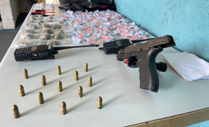 Segundo informações da ocorrência, com a dupla, foram apreendidos uma pistola calibre .40, um carregador, 13 munições, 106 pinos de cocaína, 24 pedaços pequenos e grandes de maconha, dois celulares e dois rádios de comunicação.