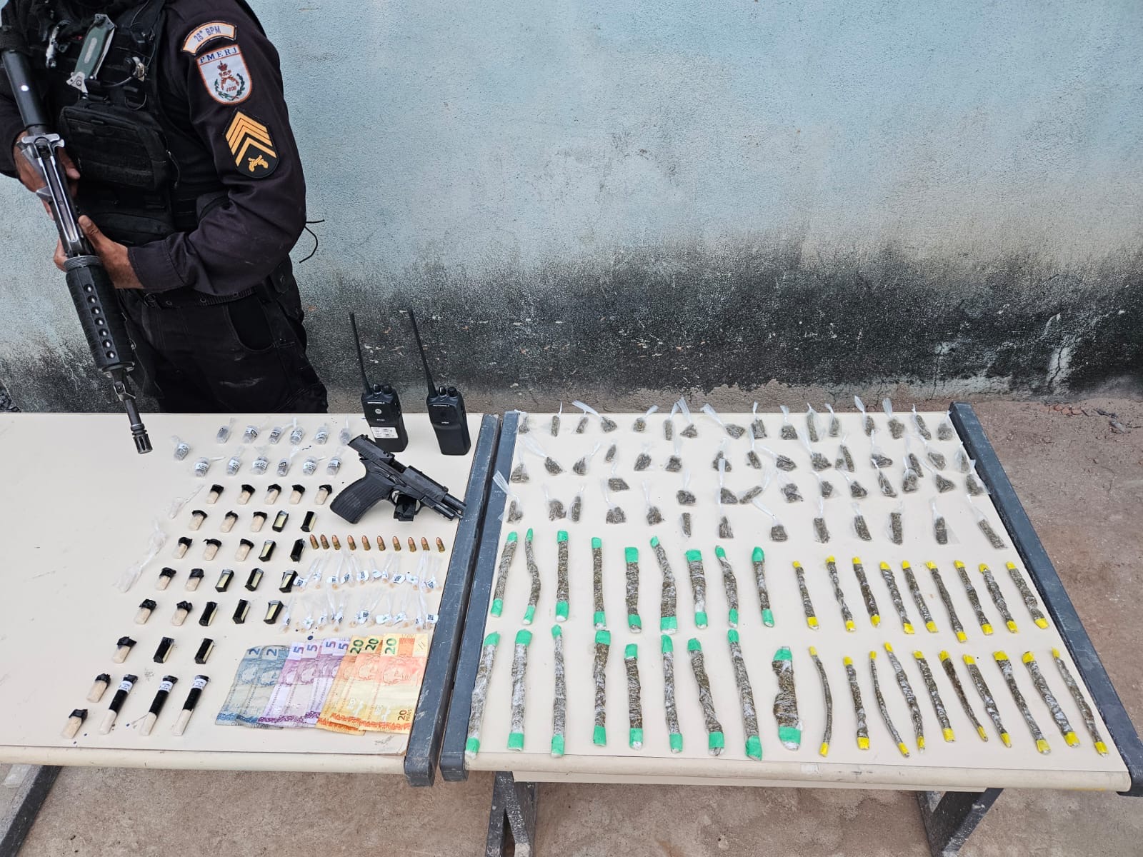 Segundo a PM, foram apreendidos uma pistola 9 mm com dez munições, 36 pinos de cocaína, 13 tambor de skunk, 22 pedras de crack e 91 porções de maconha, além de R$ 84 em espécies e dois rádios de comunicação. O material e os presos foram levados para a delegacia de Volta Redonda (93º DP), onde o caso foi registrado.