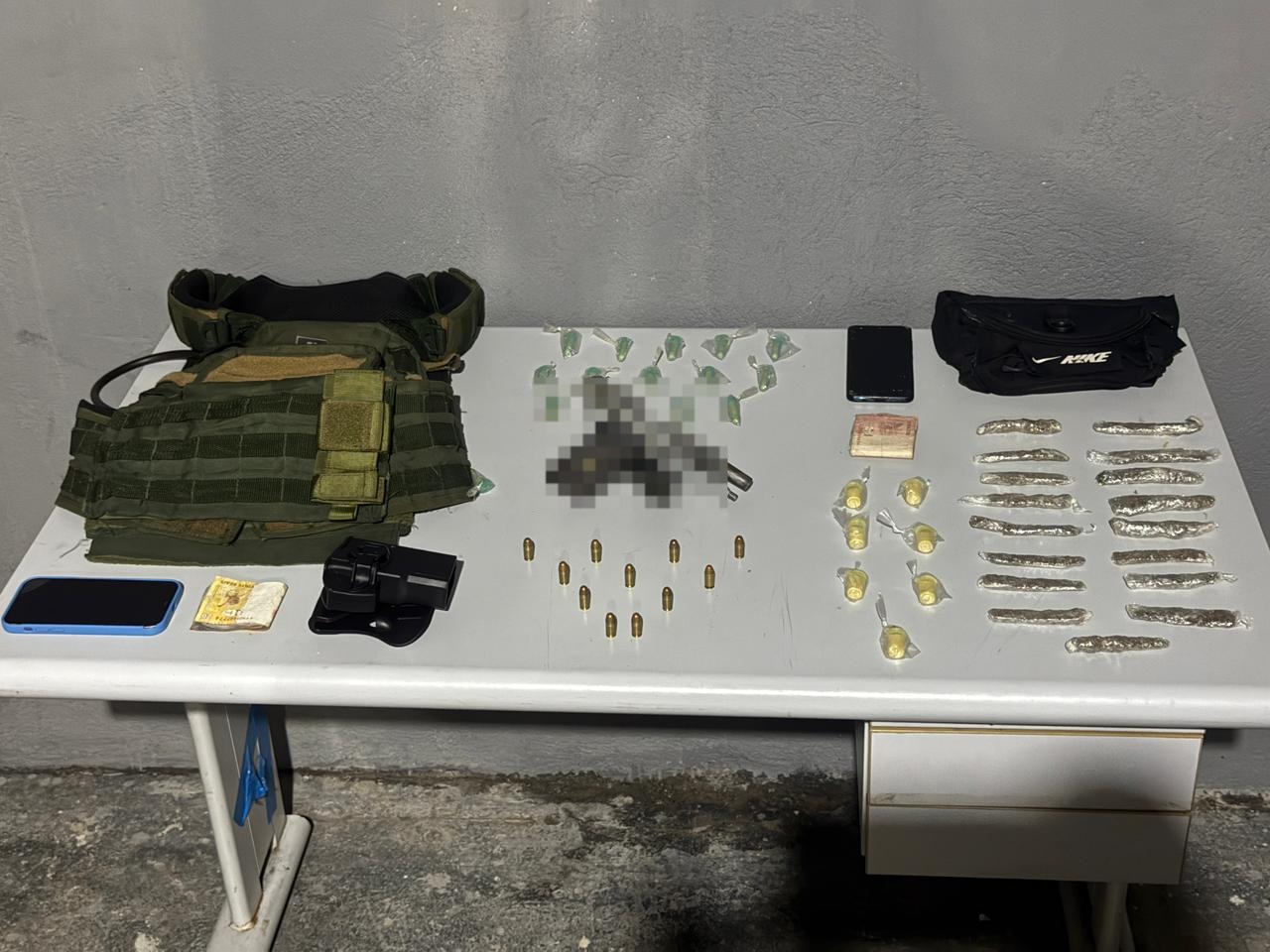Com a dupla, foram encontrados uma pistola calibre 380, 11 munições do mesmo calibre, 25 pinos de cocaína, 17 trouxinhas de maconha, uma capa de colete, um coldre, um carregador de pistola, um celular e R$ 65.