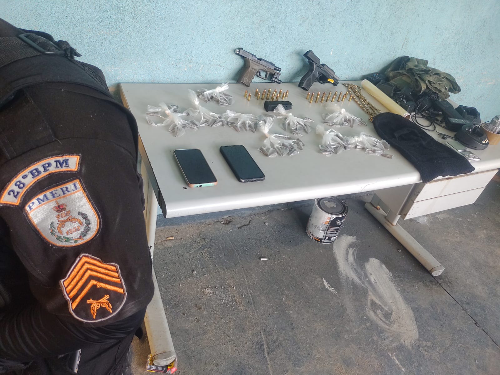 Chegando, eles tiveram a entrada na casa franqueada. Dentro dela, foram encontradas duas pistolas com 30 munições, 85 pinos de cocaína, dois rádios de comunicação. E ainda: uma roupa do exército, uma touca ninja, uma balança de precisão, dois celulares, dois cordões dourados e material para embalar as drogas.