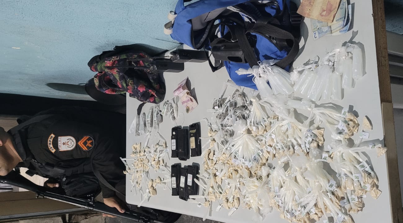 Numa delas, tinham sete pedaços de maconha, 50 sacolés de cocaína, R$ 16, um rádio de comunicação e cinco bateria de rádio. Na outra mochila, foram encontrados um rádio de comunicação, uma bateria de rádio, R$ 20 em espécies, 17 cheirinho da loló, 16 trouxinhas de maconha e 241 sacolés de cocaína.
