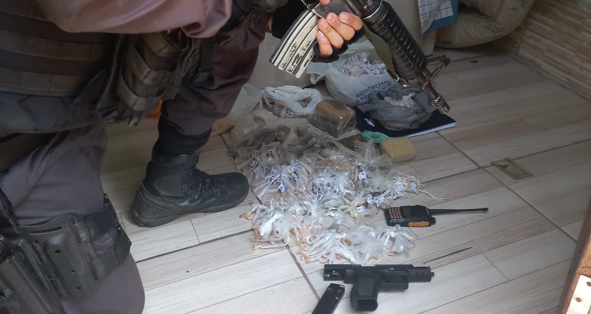 Num imóvel, os agentes encontraram uma pistola, um carregador, 15 munições, um rádio de comunicação e drogas que ainda não foram contabilizadas pela equipe da PM. Os dois jovens são moradores dos bairros Mariana Torres e Belo Horizonte, respectivamente.