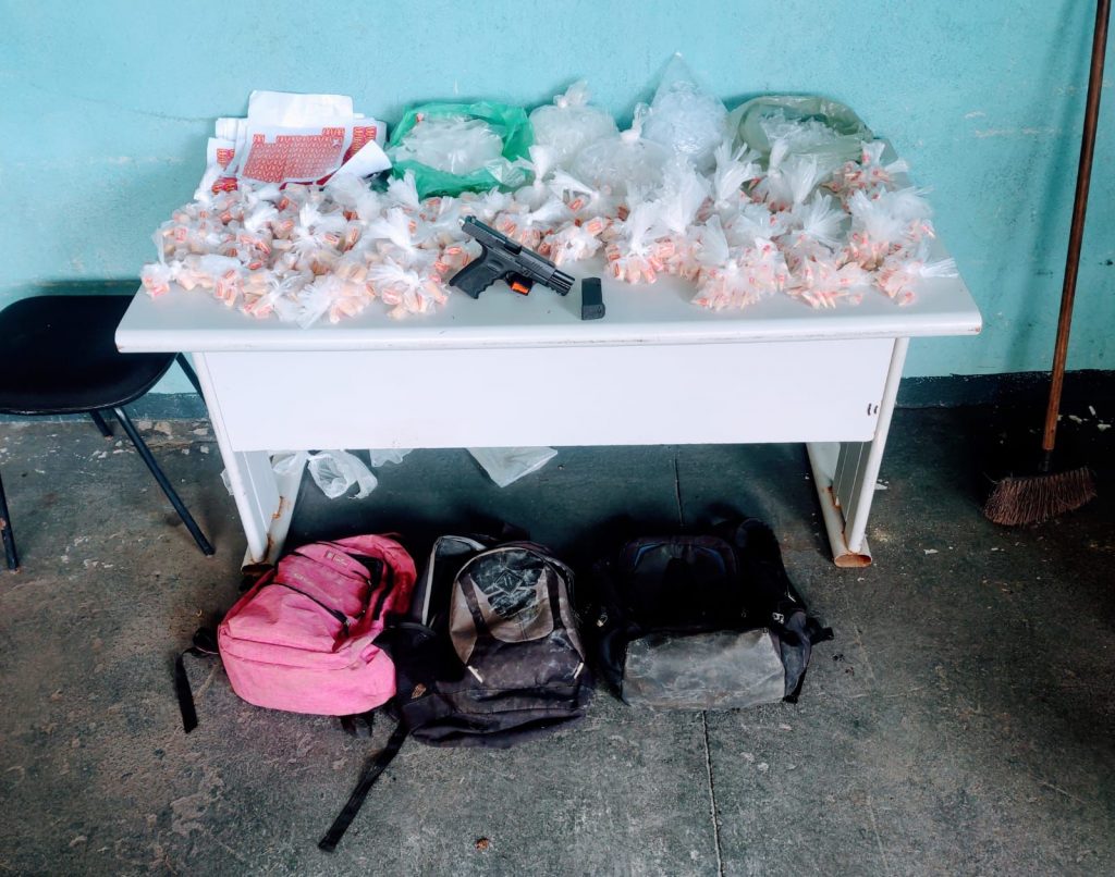 Durante a tentativa de fuga, eles abandonaram mochilas contendo a pistola, dois carregadores, 782 pinos de cocaína. Os pinos renderiam ao tráfico mais de R$ 16,6 mil. Além disso, mil pinos vazios e diversas etiquetas com descrições do tráfico.
