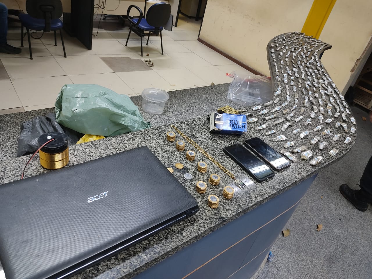 A denúncia dizia ainda que o local era comando pelo traficante conhecido como “Lo”. Chegando, os agentes encontraram os dois jovens que autorizaram a entrada dos policiais militares no imóvel. Lá dentro, foram encontradas 251 trouxinhas de maconha com a discrição do Comando Vermelho, 26 munições intactas de calibre 38; R$ 81 em espécies, dois aparelhos celulares bloqueado e notebook da Acer, além de um cordão.