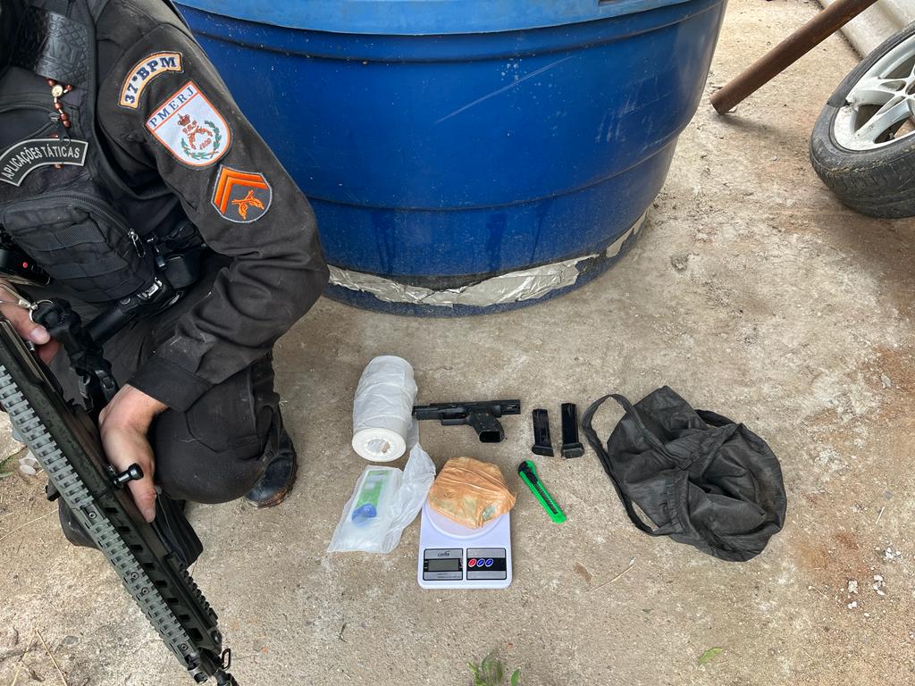 Durante a fuga, eles se desfizeram dos materiais do tráfico de drogas. No entanto, após varredura pelo local, os policiais encontraram uma pistola 9mm com dez munições, dois carregadores de pistola, uma balança de precisão e um tablete de crack.