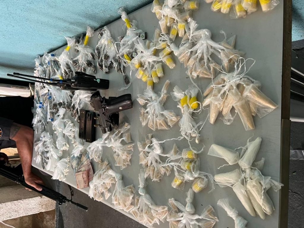Na outra, os policiais haviam 279 pinos de cocaína, 49 tambores da mesma droga, 88 sacolés de maconha, 47 tiras da mesma droga, sete frascos de “cheirinho da loló”, 72 pedras de crack e dois rádios transmissores.