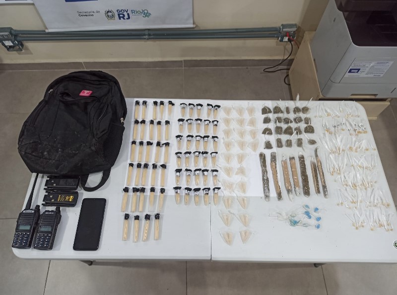 De acordo com a Polícia Militar, durante a ação foram apreendidos 107 pinos de cocaína, 19 trouxinhas de maconha, 117 pedras de crack, 11 comprimidos de ecstasy, dois rádios transmissores e um celular. O material estava em uma mochila. (Foto: PM/Divulgação. Reportagem Informe Cidade)