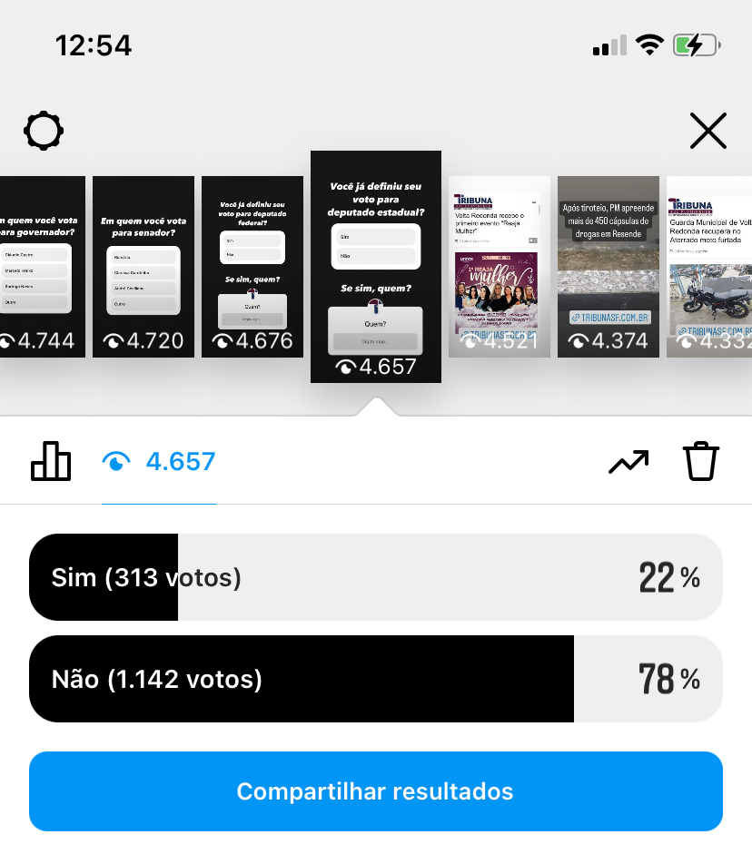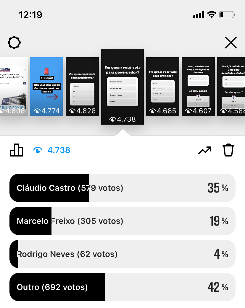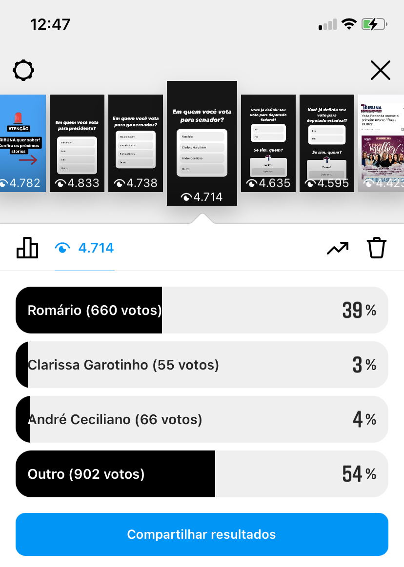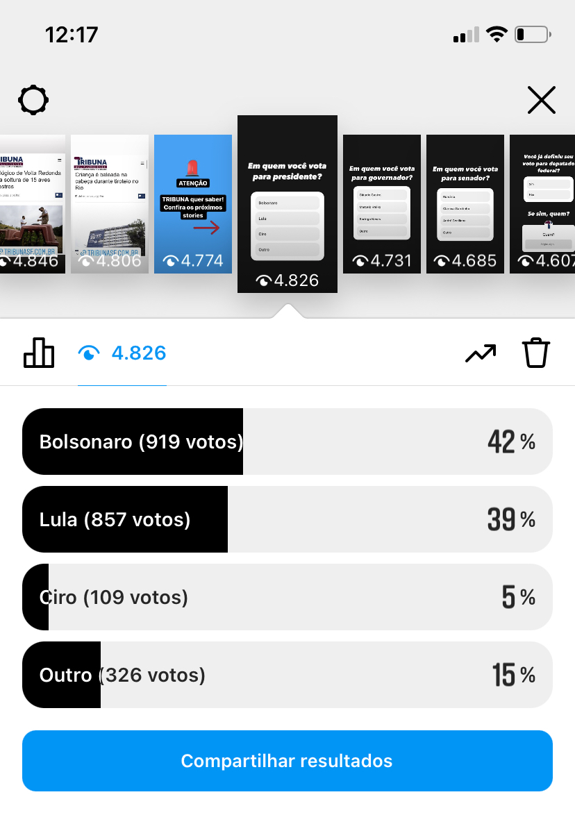 Vale lembrar que a enquete não tem a mesma metodologia dos Institutos de pesquisa cadastradas Justiça Eleitoral. É apenas opinião dos seguidores do TRIBUNA no Instagram. Vale lembrar que todos citados são pré-candidatos, menos o Ciro Gomes que já realizou o convenção do PDT.