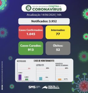 As informações foram passadas pela prefeitura de Volta Redonda. Ao todo, são 116 pessoas com o vírus ativo; dos quais, 72 estão internados.