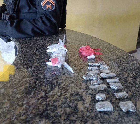 Após revista no imóvel, os PMs encontraram 16 trouxinhas de maconha e 12 pinos contendo pó branco.
