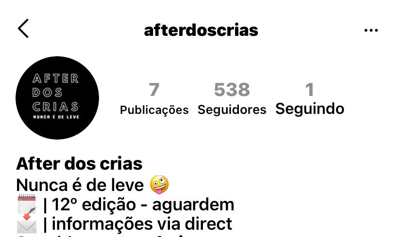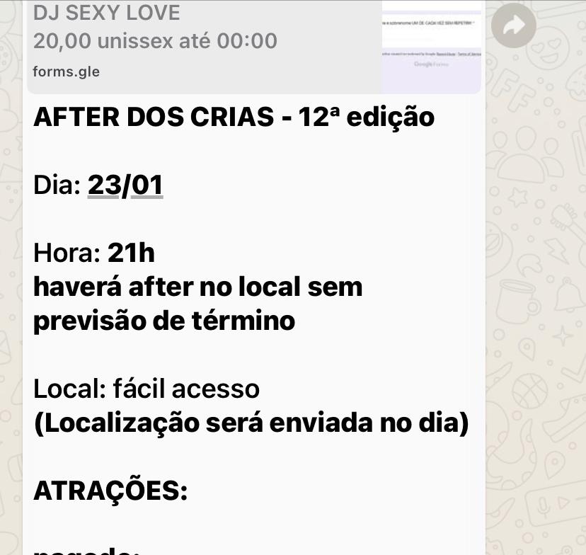 O aviso da festa deixa claro: o local será enviado no dia do evento. Isso mostra a clandestinidade do encontro, que é intitulado “After dos Crias” – 12º edição. O evento está marcado para ocorrer no próximo sábado (23) e, segundo fontes, acontecerá em Volta Redonda.
