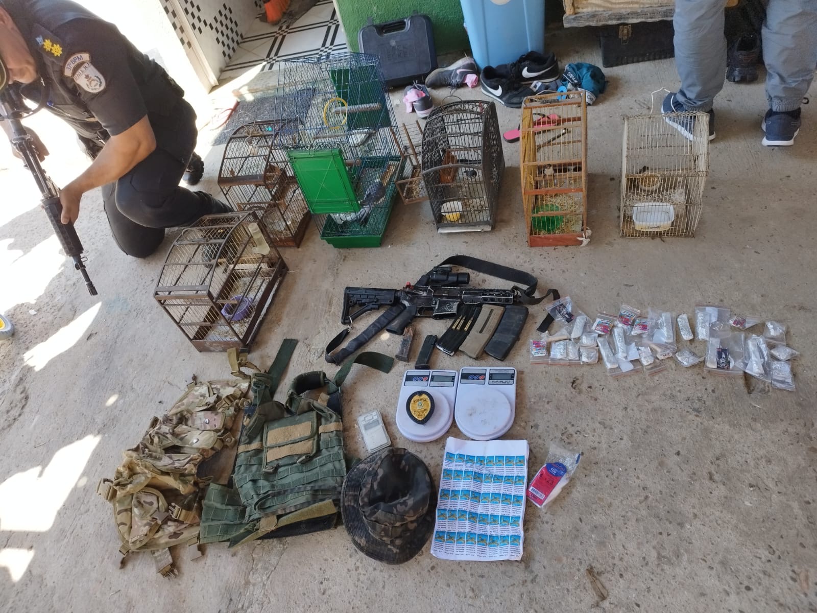 Chegando, os agentes encontraram um fuzil calibre 5.56, três carregadores, dois carregadores de pistola, quatro munições, 22 invólucros de maconha, dois pinos de cocaína, três balanças de precisão, um soco inglês, etiquetas para embalar drogas e uma capa de colete.