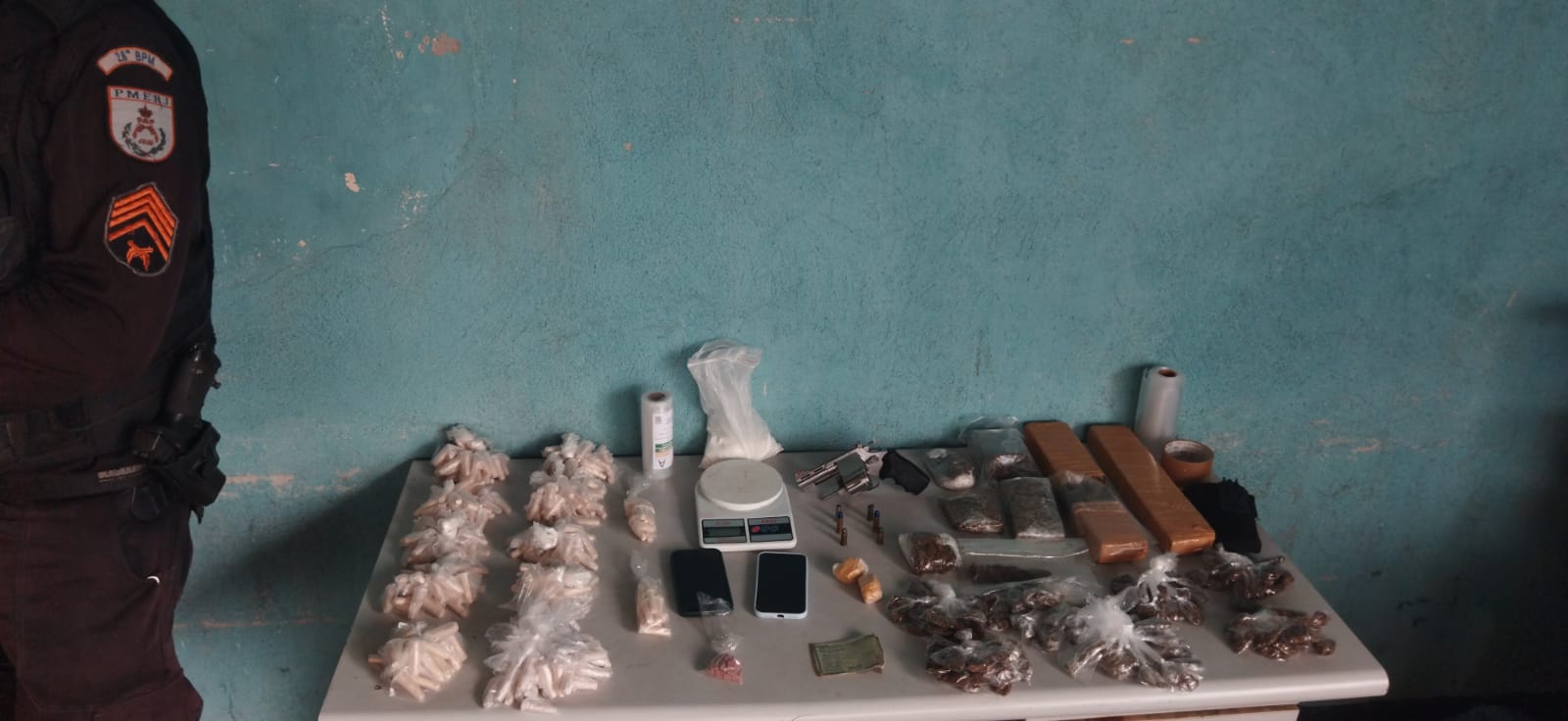 Chegando ao local, os policiais se depararam com os dois suspeitos. Com eles, foram apreendidos um revólver com seis munições; 320 pinos de cocaína, outras duas pedras da mesma droga e um tablete de maconha. E ainda: 106b trouxinhas de maconha, dois celulares, uma balança de precisão.