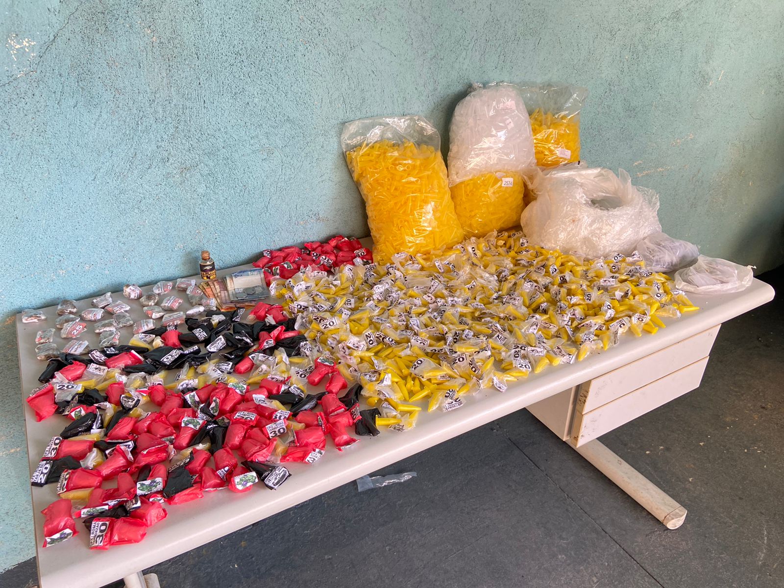 Ele apontou o material do tráfico. Na operação, foram apreendidos 650 pinos de cocaína R$20,00; 30 pinos de cocaína R$30,00; três mil pinos vazios; 44 frascos vazios e vasta quantidade de etiquetas e sacolés.