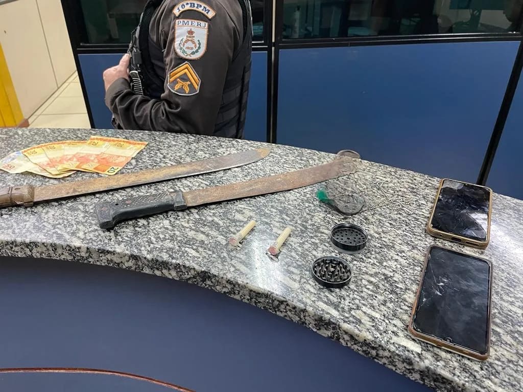 Os policiais civis e militares, então, foram até o endereço. Chegando, os agentes flagraram o acusado pulando a janela, tentando fugir. Porém, logo foi capturado. Dentro da residência, os policiais encontraram dois facões, dois pinos de cocaína, uma câmera de monitoramento, R$ 150, uma fita adesiva e dichavador – equipamento para triturar a maconha.
