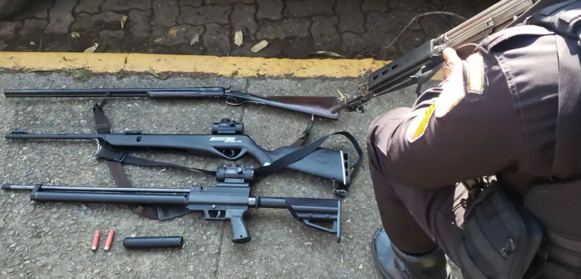 Além da espingarda, a PM também apreendeu na casa do suspeito dois rifles de pressão e dois cartuchos intactos de calibre 32.
