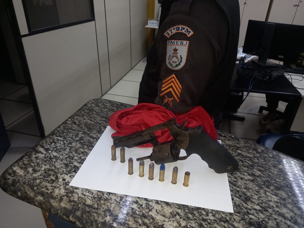 Na residência, os policiais apreenderam um revólver calibre com seis munições, sendo um deflagrada. Outras duas munições foram encontradas na cozinha da casa.