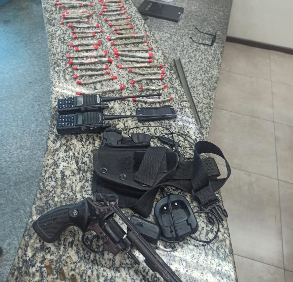 Chegando, eles comprovaram a informação e detiveram o suspeito. Com ele, foram apreendidos um revólver de calibre 38 com cinco munições; 42 tiras de maconha, 25 pinos de cocaína e 17 pedras de crack. E ainda: R$ 109 em espécies, dois rádios de comunicação e um cinto tático. Todo o material estava escondido numa mochila no bloco B do conjunto habitacional.