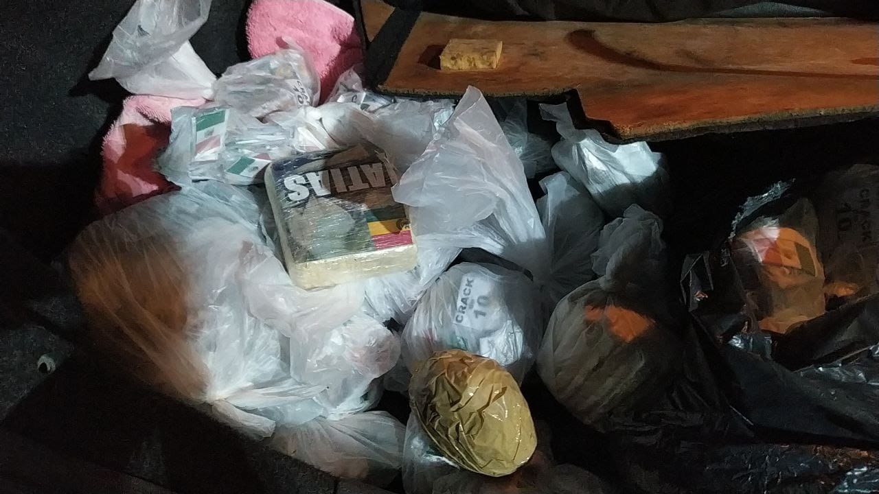 Ao realizarem revista no interior do veículo, foram encontrados vários cigarros de maconha e crack; vários papelotes de cocaína; vários mini tabletes de maconha; e meio tablete de cocaína (cerca de 500 g), quase a totalidade do material estava pronta para venda no varejo em “bocas de fumo”.