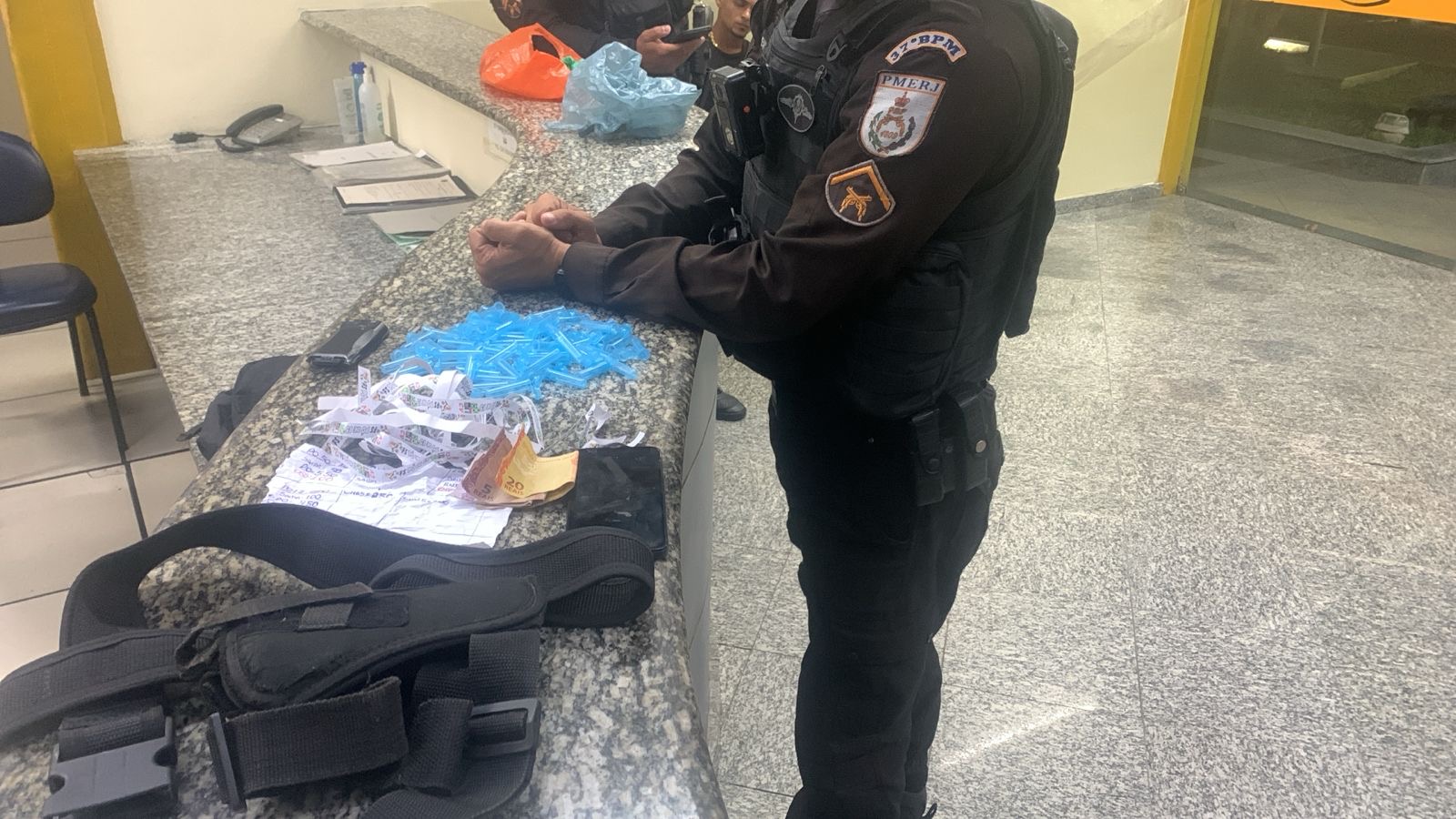 No local, os policiais apreenderam 60 ependorfs vazios, uma folha com anotações do tráfico, 24 tiras de adesivo com inscrições relacionadas ao comércio de entorpecentes, além de uma bateria de rádio transmissor.